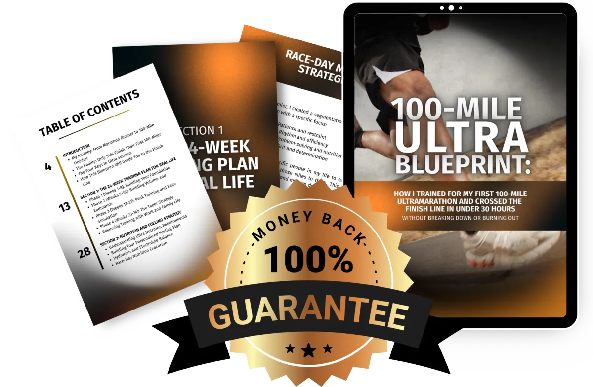 When you purchase the 100-Mile Ultra Blueprint, you'll receive a comprehensive guide that includes a realistic 24-week training plan divided into four progressive phases, a nutrition framework to calculate your personal fueling needs, proven mental toughness techniques that work even when you're exhausted, gear selection guidance to prevent equipment failures, and detailed race execution strategies to help you finish strong without breaking down.